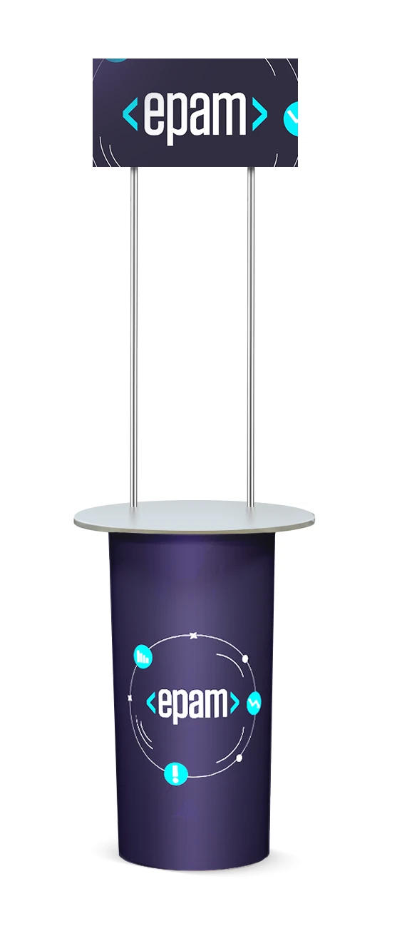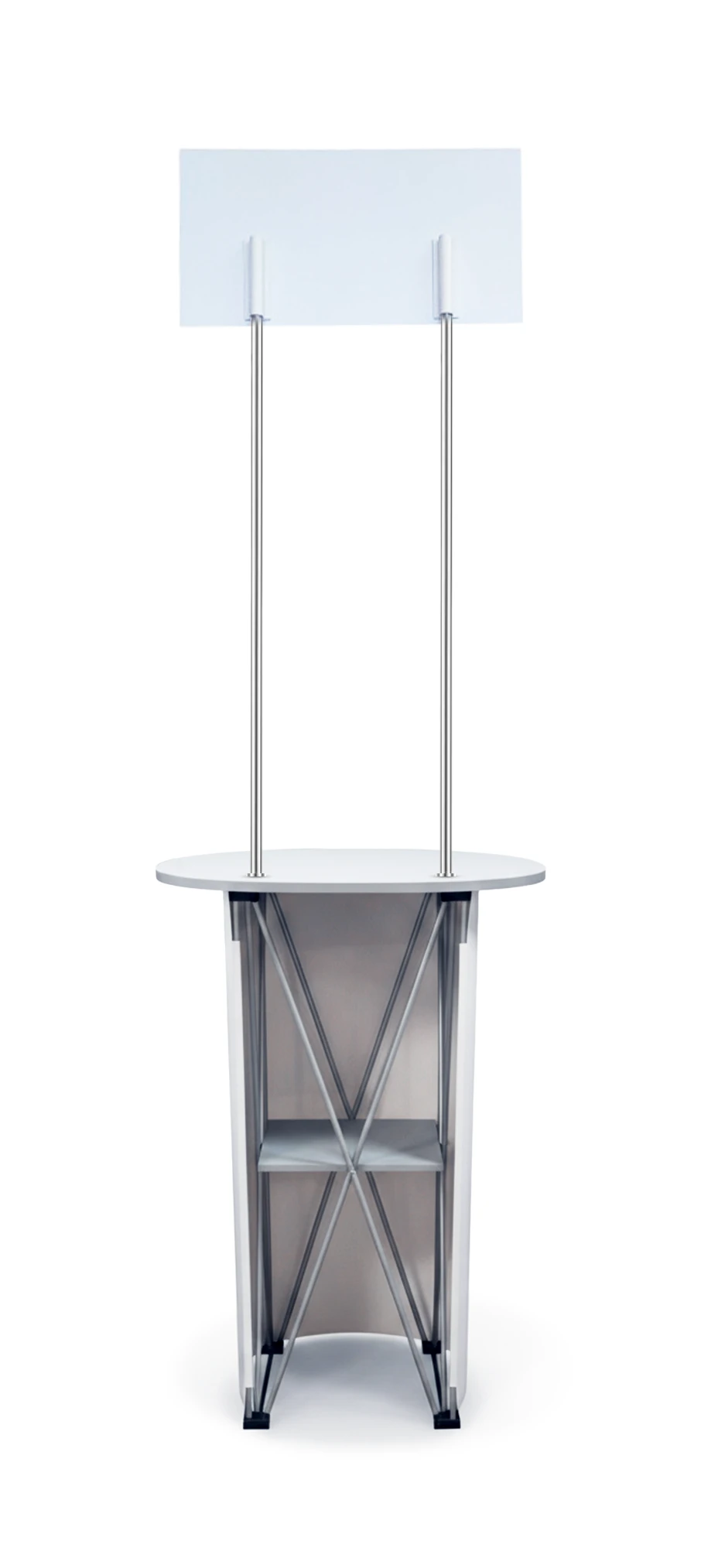Цей складний стіл незамінний у маленьких супермаркетах для дегустацій, PR-акцій, роздачі призів чи буклетів. На виставках чи конференціях слугуватиме робочим столом для персоналу, викладкою товарів, каталогів — плюс бонусна рекламна площа. Складається з циліндричної тумби для брендингу вашої компанії та фриз (топера).